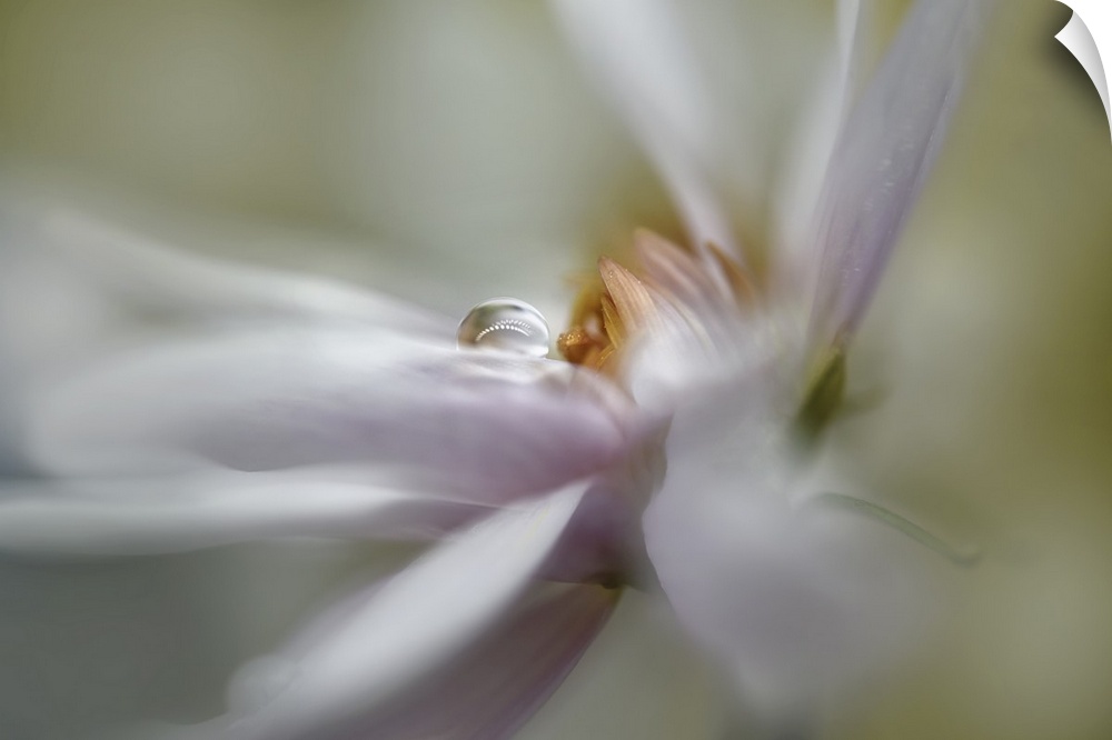 <p>A photo of a flower head, shot with a large aperture to achieve a soft and ethereal feeling. A drop of water is placed on one of the petals.</p>