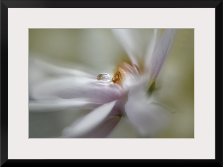 <p>A photo of a flower head, shot with a large aperture to achieve a soft and ethereal feeling. A drop of water is placed on one of the petals.</p>
