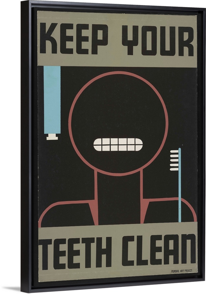 <p>Artwork promoting good oral hygiene, showing stylized face, toothbrush and toothpaste.</p>