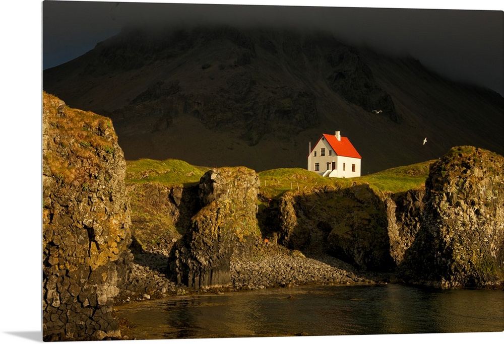 <p>A small white house with a red roof on the steep cliffside of Snaeflesnes, Iceland.</p>