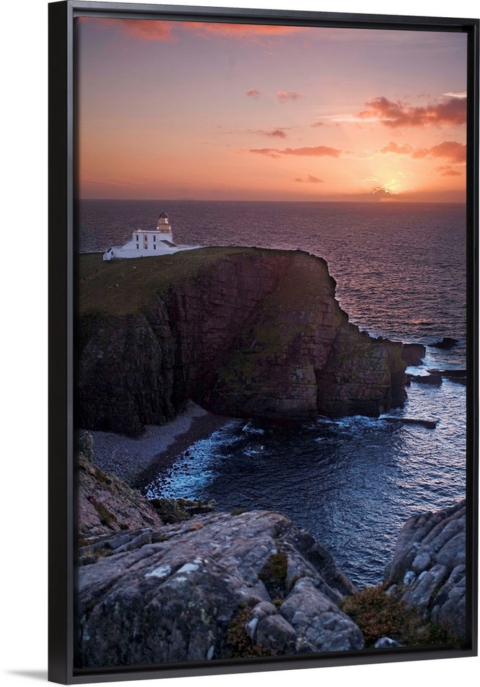 <p>A sunset seascape over Neist Point Lighthouse, Isle of Skye, Scotland with a peach and gold sky.</p>