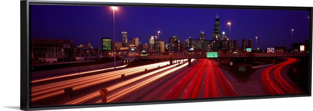 <p>Panoramic photograph of highway filled with light trails with lit up city skyline in the distance at night.</p>