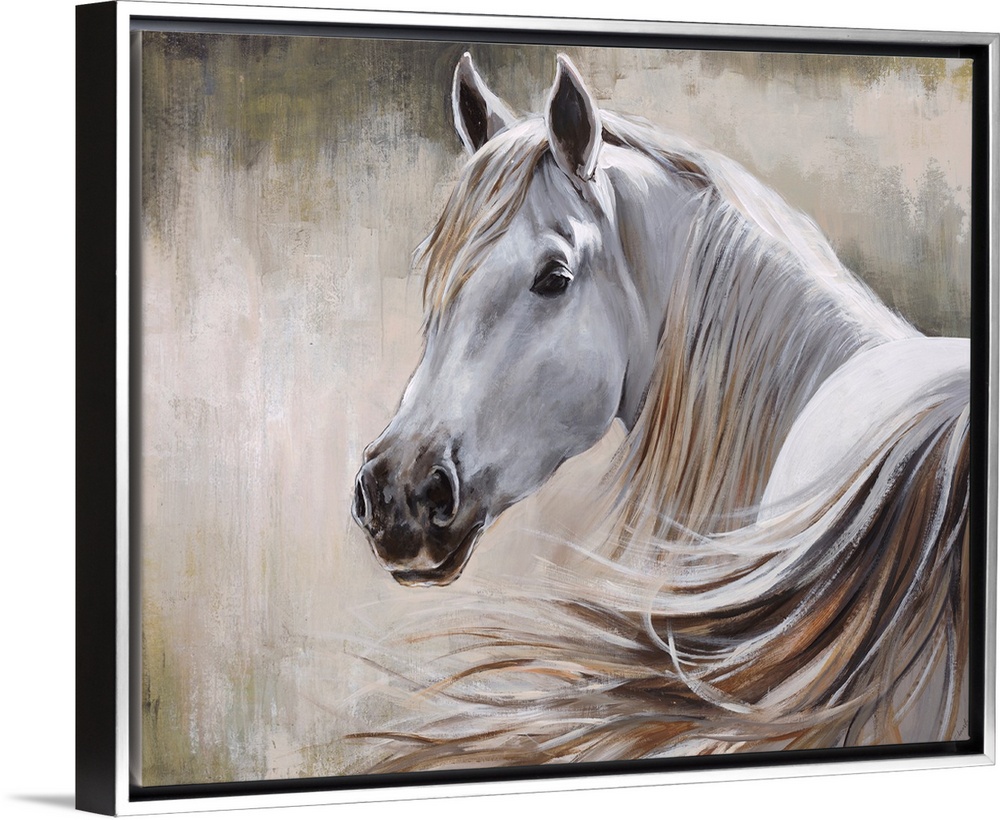 <p>Contemporary painting of a white horse and its flowing mane in front of a neutral background.</p>