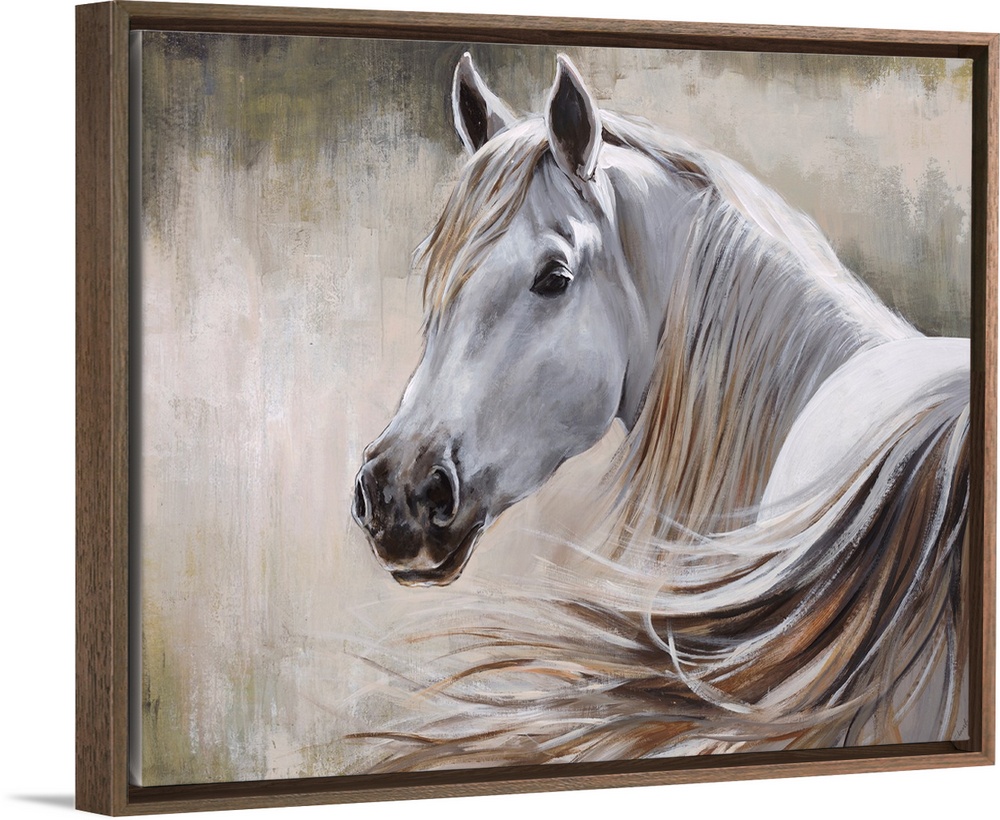 <p>Contemporary painting of a white horse and its flowing mane in front of a neutral background.</p>