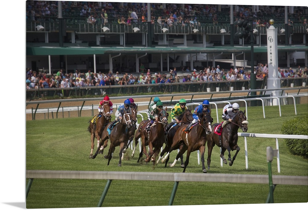 <p>USA, Kentucky, Louisville. Horses racing on turf at Churchill Downs.</p>