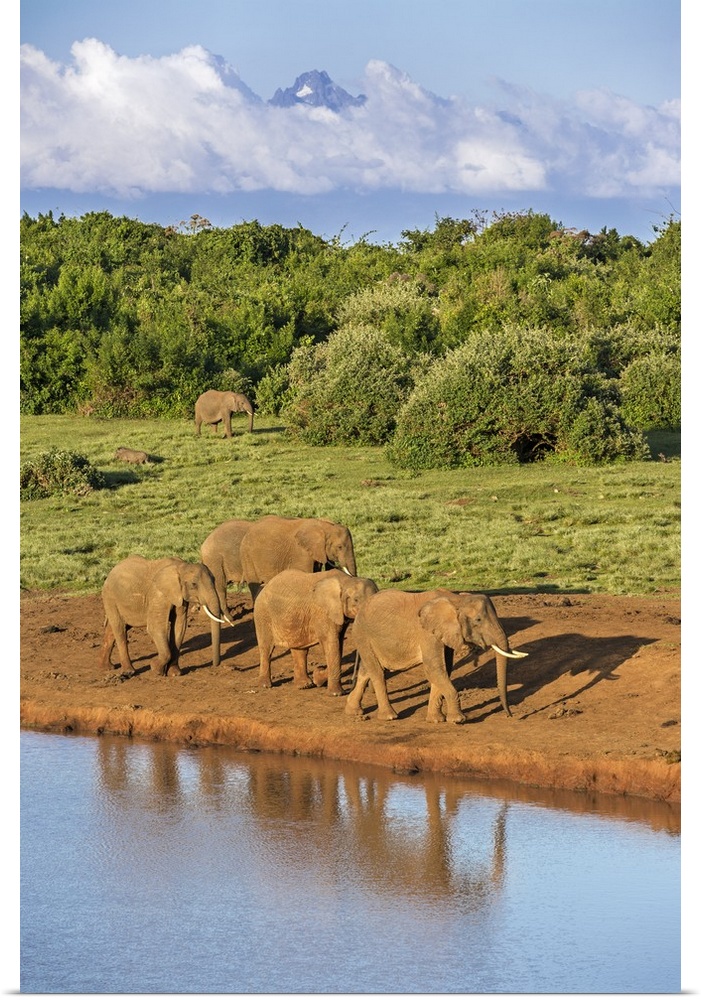 <p>Kenya, Nyeri County, Aberdare National Park. A herd of African elephants come to drink at a waterhole in the Aberdare National Park in the late afternoon with Mount Kenya rising majestically in the distance.</p>