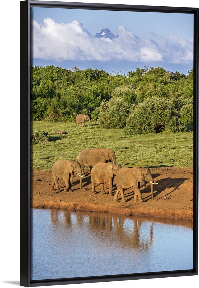 <p>Kenya, Nyeri County, Aberdare National Park. A herd of African elephants come to drink at a waterhole in the Aberdare National Park in the late afternoon with Mount Kenya rising majestically in the distance.</p>