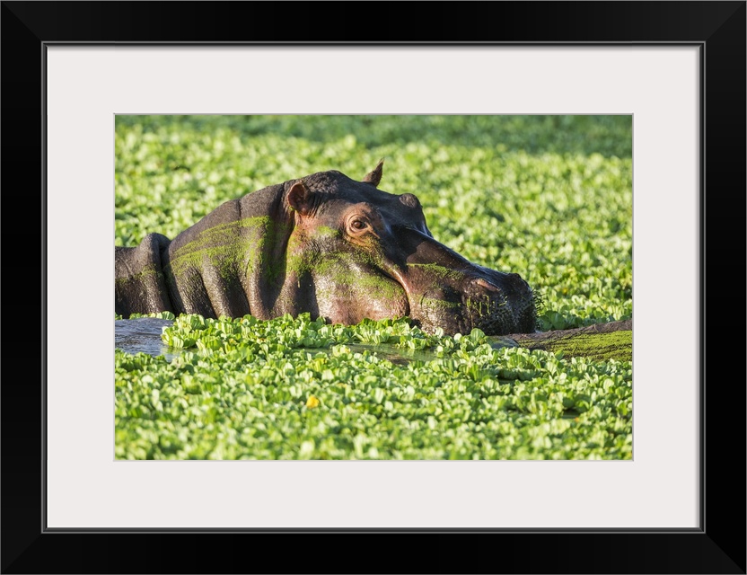 <p>Kenya, Narok County, Masai Mara. A hippo wallows among Nile cabbage in a large rainwater pool near the Mara River.</p>