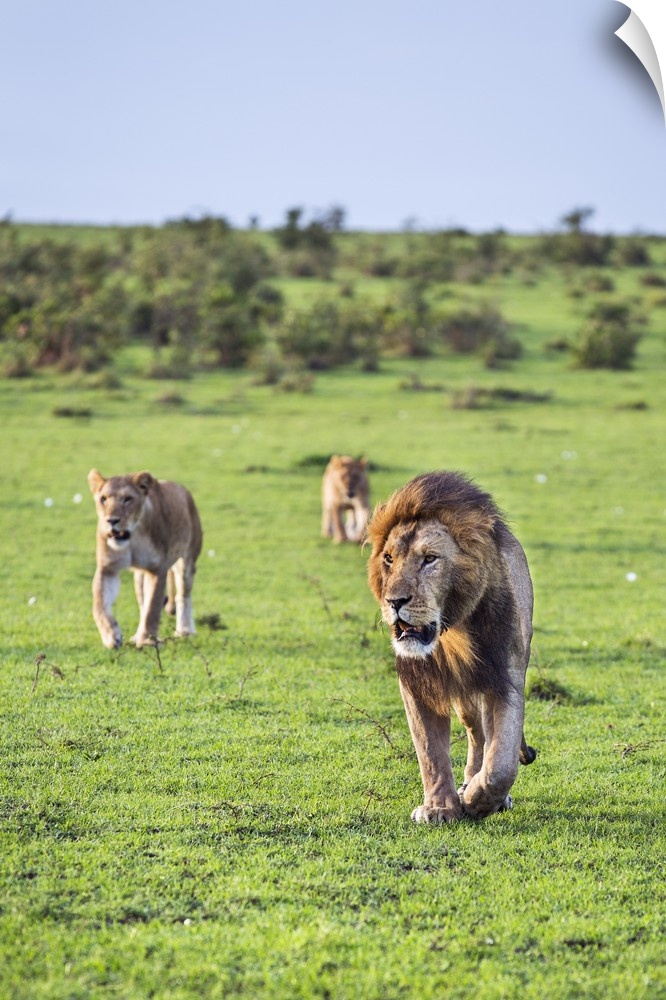 <p>Kenya, Narok County, Masai Mara National Reserve. A pride of Lions crosses open country in Masai Mara.</p>