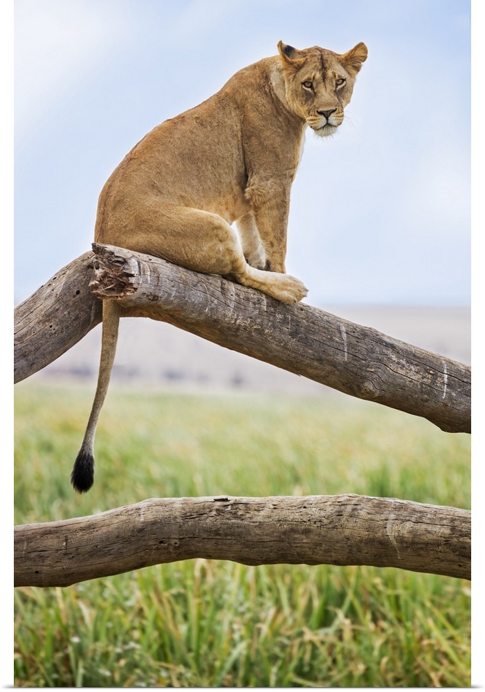 <p>Kenya, Meru County, Lewa Wildlife Conservancy. A Lioness sitting on the branch of a dead tree.</p>