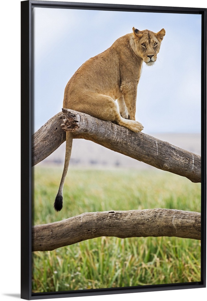 <p>Kenya, Meru County, Lewa Wildlife Conservancy. A Lioness sitting on the branch of a dead tree.</p>