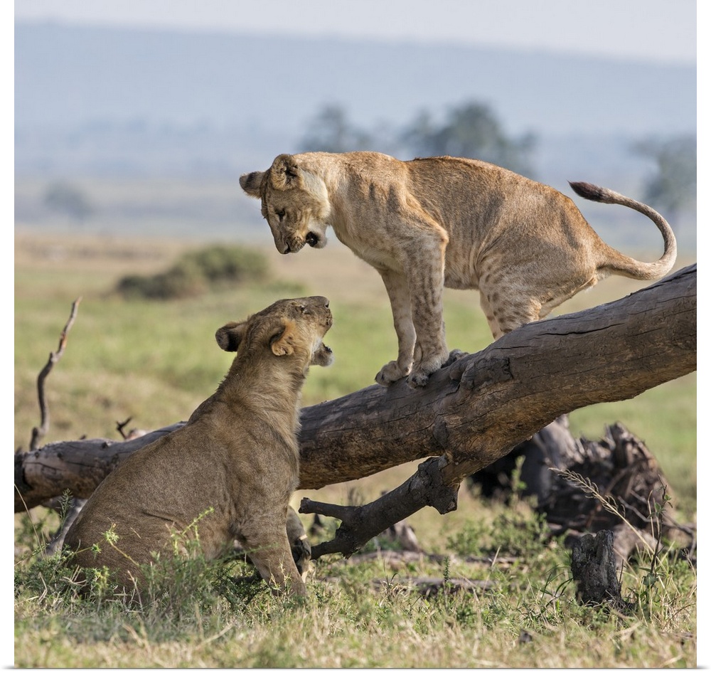 <p>Kenya, Masai Mara, Narok County. Lion cubs play on a fallen tree trunk in Masai Mara National Reserve.</p>