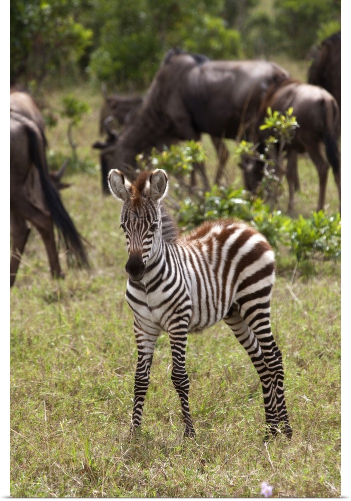 <p>Kenya, Maasai Mara. A young zebra stands alone, in front of a herd of wildebeest.</p>