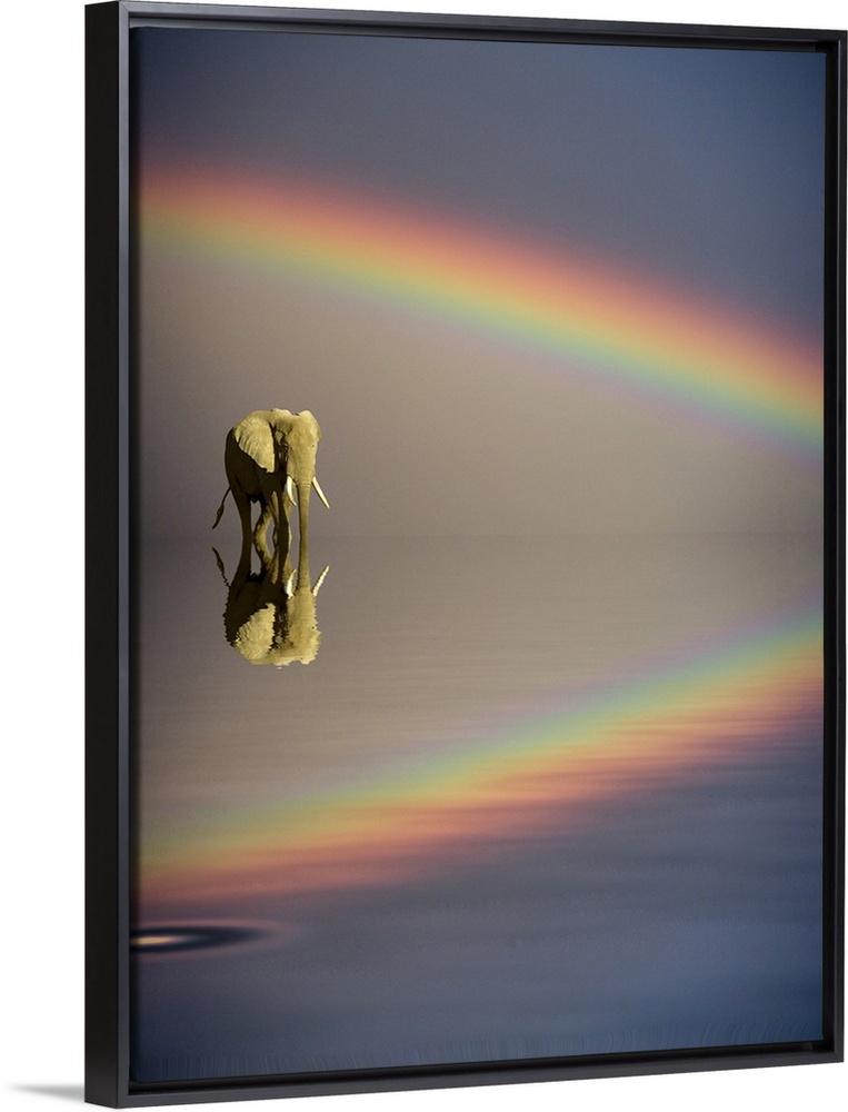 <p>Africa, Kenya, Masai Mara Game Reserve. Composite of bull elephant, water and rainbow.</p>