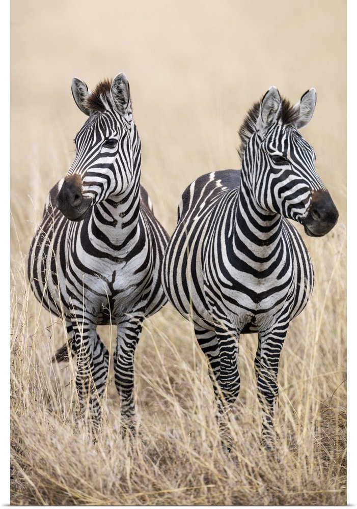 <p>Kenya, Masai Mara, Narok County. Two common Zebras on the dry grasslands of Masai Mara.</p>