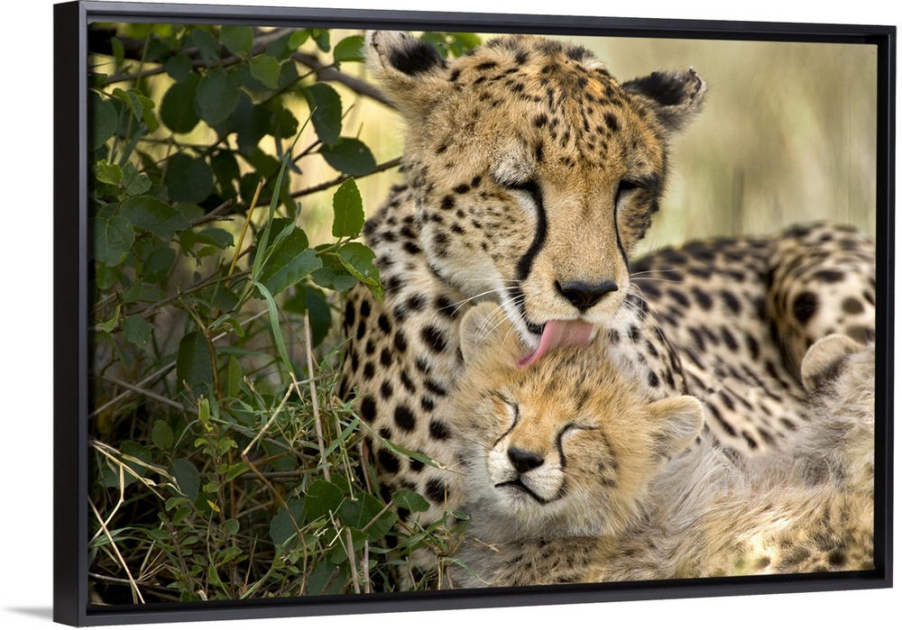 <p>Kenya, Masai mara national reserve. Cheetah mother grooming cub.</p>