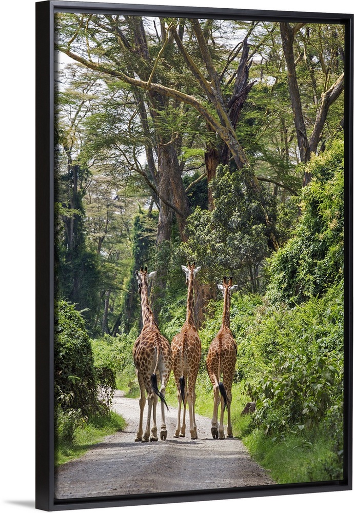 <p>Kenya, Nakuru, Nakuru County. Three Rothschild giraffes saunter down a track.</p>