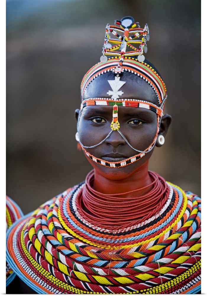 <p>Kenya, Laikipia, Ol Malo. Young Samburu girl dressed in her traditional beaded necklaces and headress at a dance.</p>