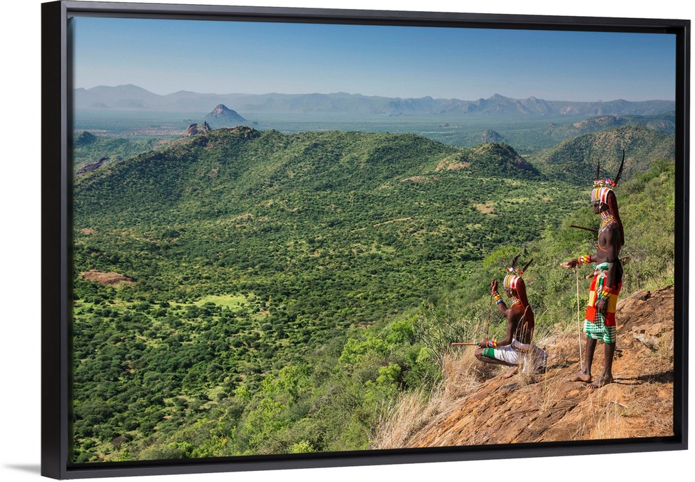 <p>Kenya, Kirimun, Samburu County. Two Samburu warriors pause to look for livestock on the edge of the Kirimun escarpment.</p>