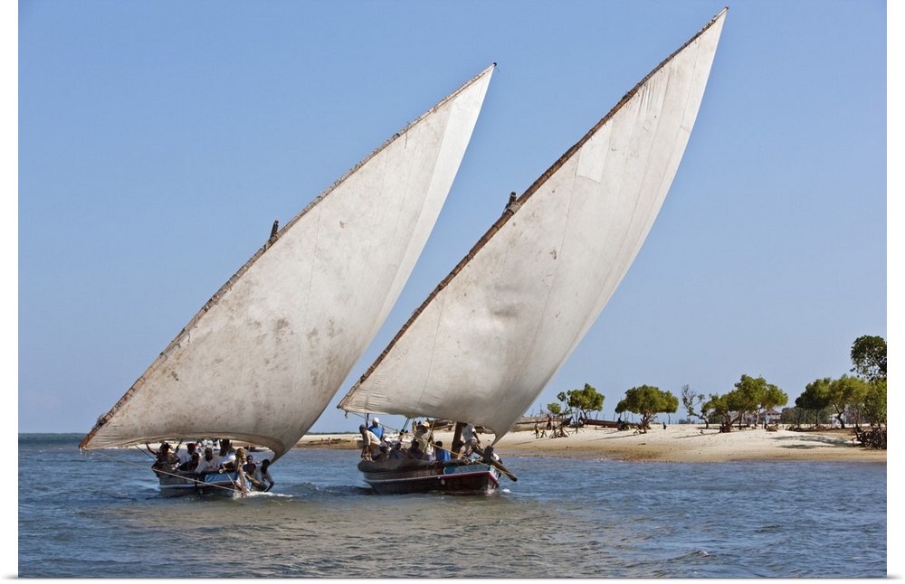 <p>Kenya. Two Jahazi boats sailing off Lamu Island. The main way to transport goods in the Lamu Archipelago.</p>