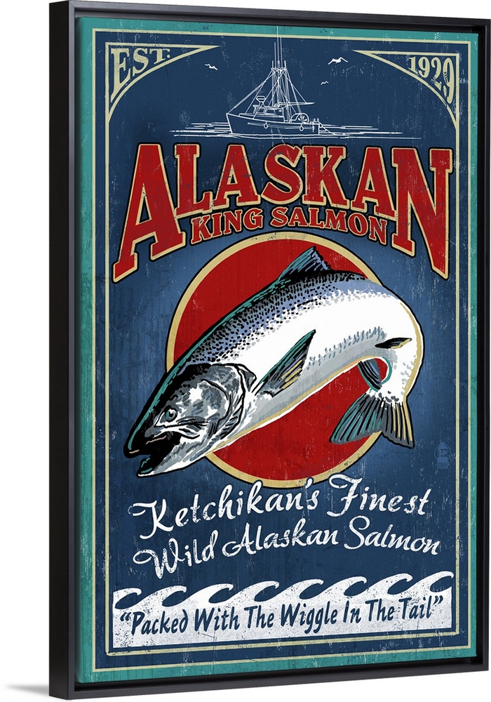 <p>Retro stylized art poster of seafood market sign displaying salmon.</p>