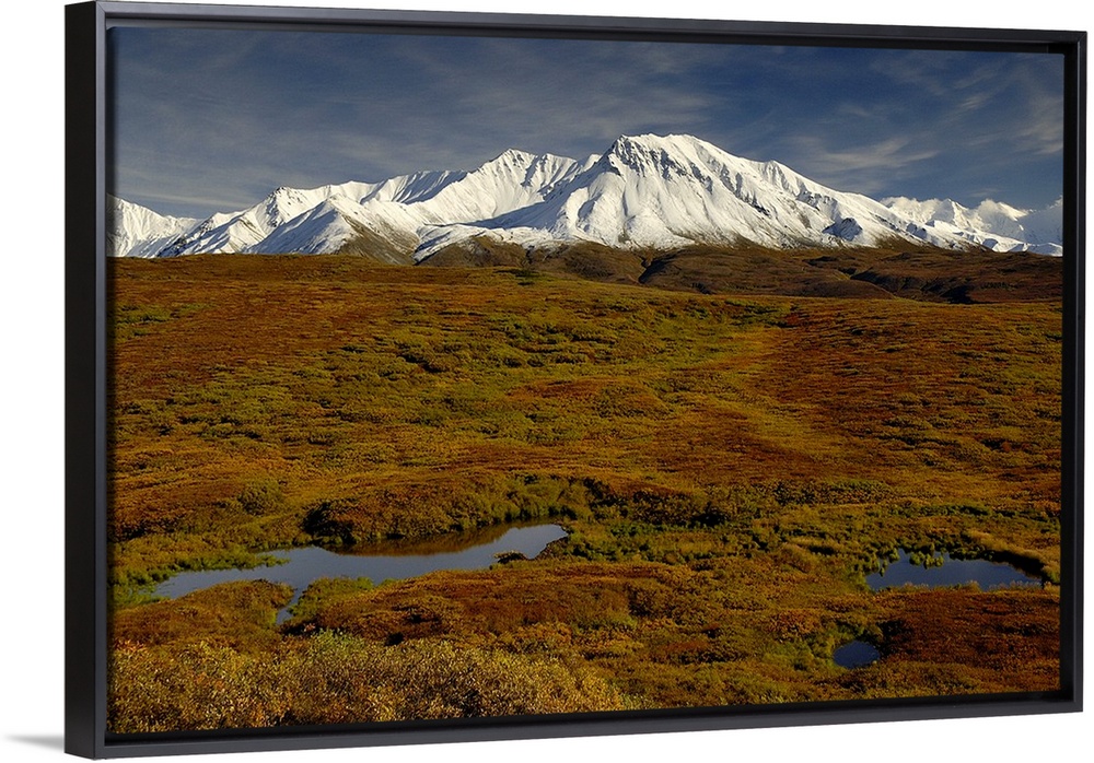 <p>Kettle ponds and tundra in fall foilage front snow-capped peaks in the Alaska Range.</p>