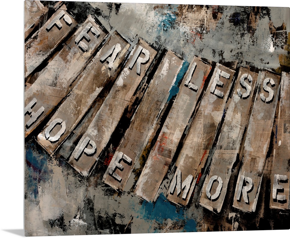 <p>Contemporary artwork with long blocks and the words fear less, hope more spelled out on them. The background is abstract with blotches of cooler colors.</p>
