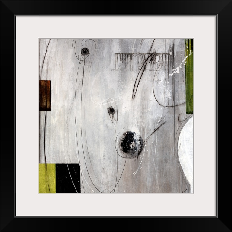 <p>This piece of abstract artwork has different blocks of color on the sides of the print with swirls of black drawn over the grey background.</p>