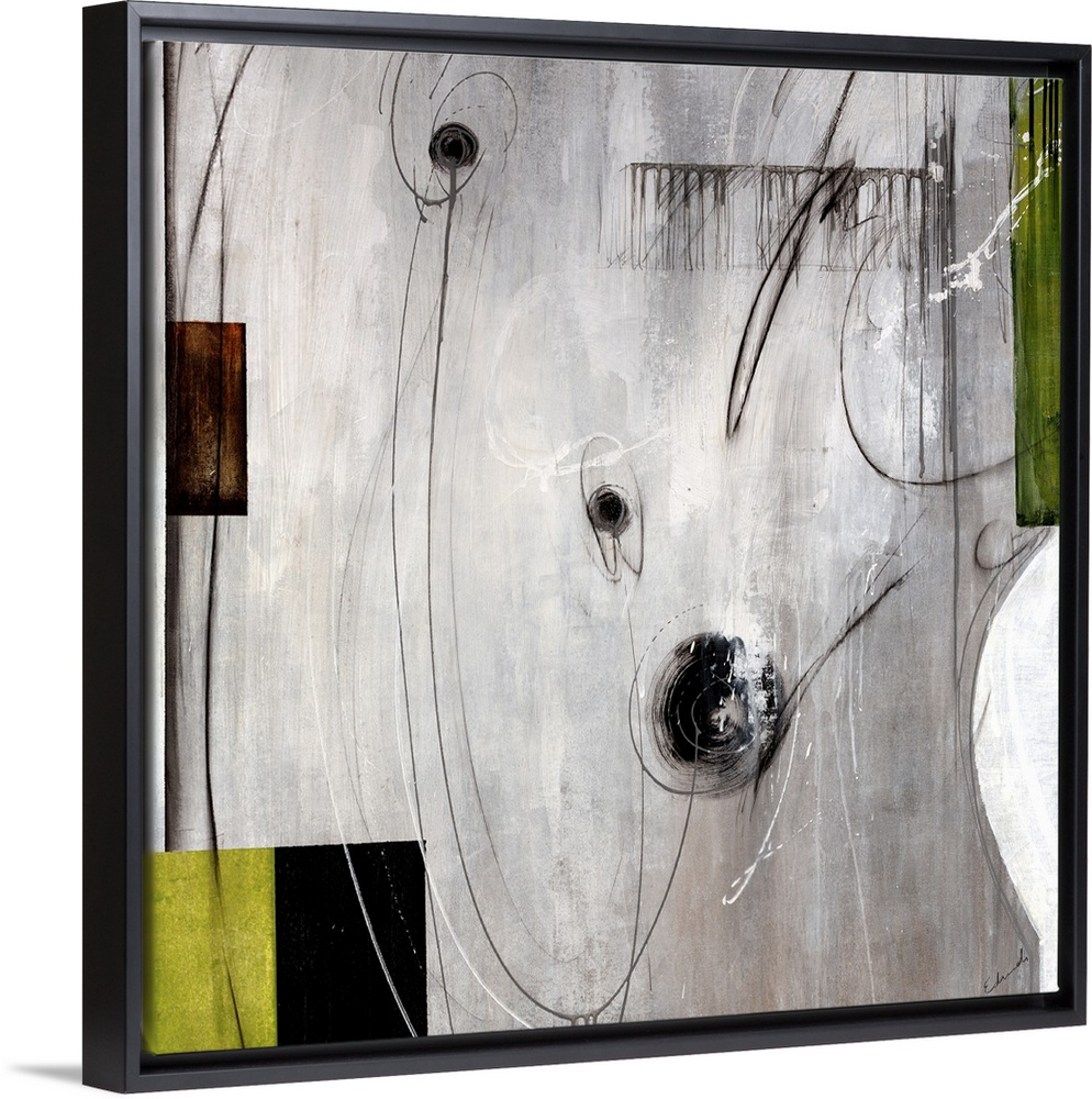 <p>This piece of abstract artwork has different blocks of color on the sides of the print with swirls of black drawn over the grey background.</p>