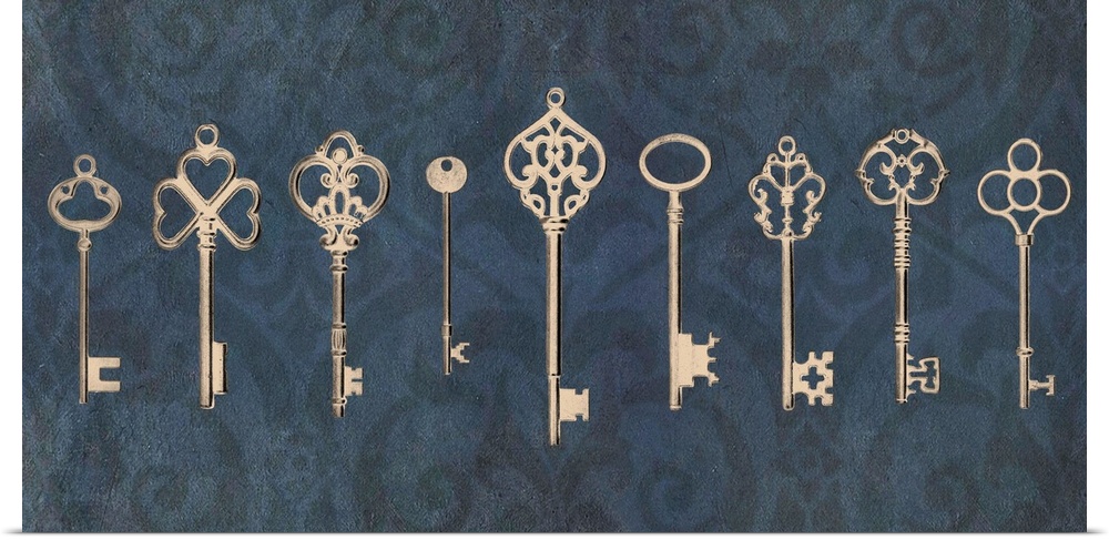 <p>An assortment of vintage keys with ornate designs arranged in a row on a navy blue background.</p>