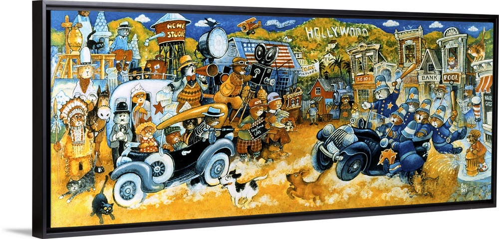 <p>Cat-cops chasing bad guys in black car on a Hollywood movie set.</p>