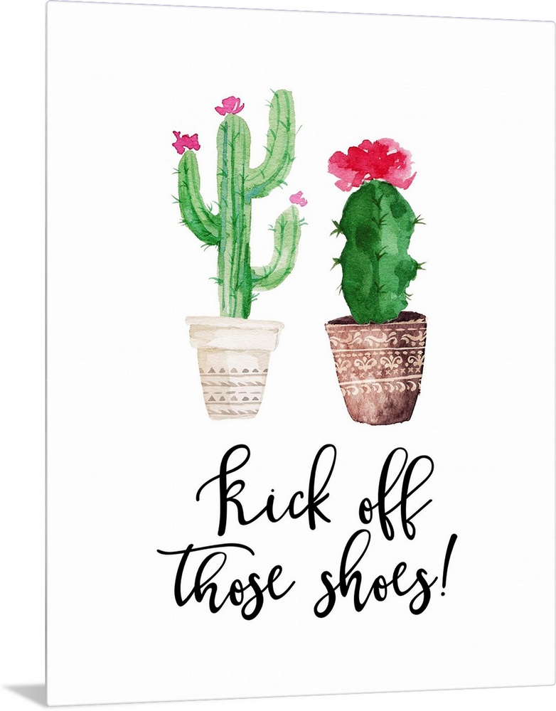 <p>This decor features watercolor cactus plants with the words, "Kick off those shoes" underneath.</p>