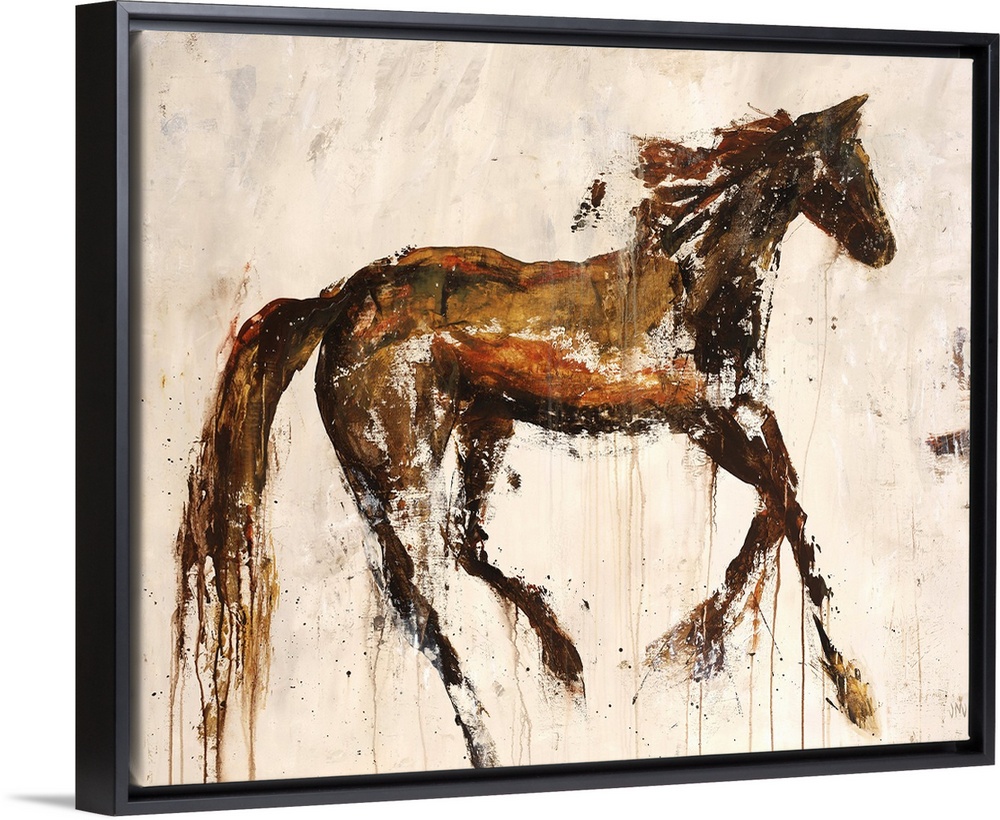 <p>Contemporary painting of a brown rustic looking horse in a galloping motion.</p>