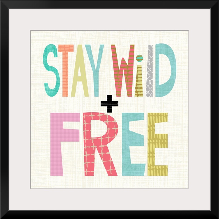 <p>Children's typography artwork in colorful block letters reading "Stay Wild and Free."</p>