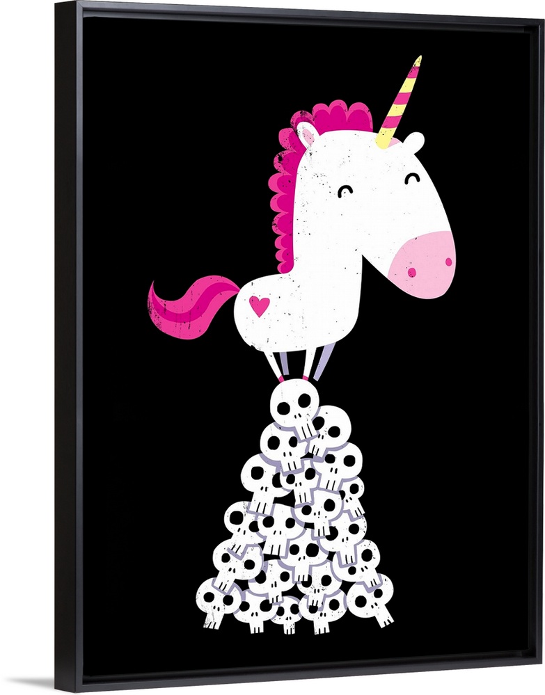 <p>A digital illustration of an unicorn on top of a pile of skulls.</p>
