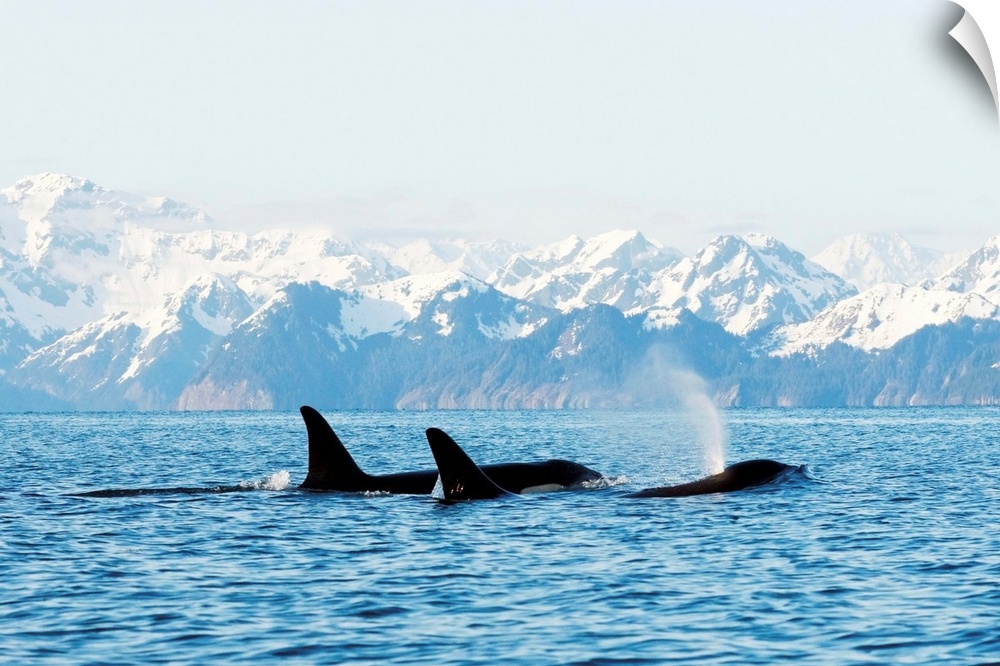 <p>Killer whale, or orcas, Orcinus orca, pod in traveling in Resurrection Bay, Kenai Fjords National Park, outside Seward, Alaska, spring.</p>