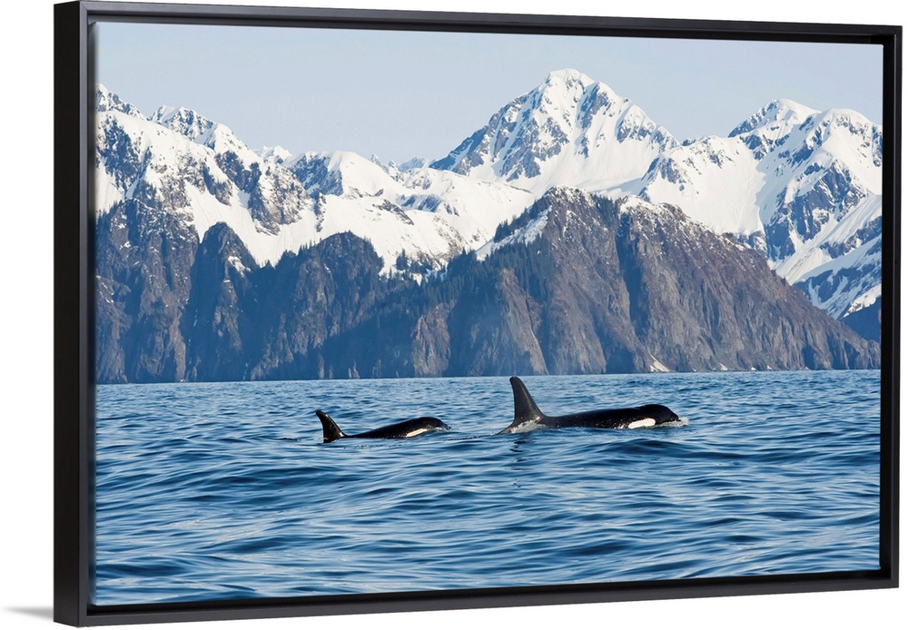 <p>Killer whale, or orcas, Orcinus orca, cow and calf swimming in Resurrection Bay, Kenai Fjords National Park, outside Seward, Alaska, spring.</p>
