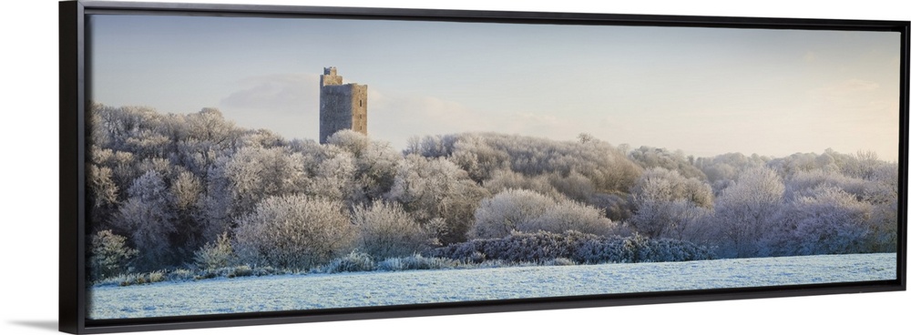 <p>Kilworth Castle, an old castle ruins overlooking a snow-covered forest and field in winter at sunrise, stitched composite panorama; Kilworth, County Cork, Ireland.</p>