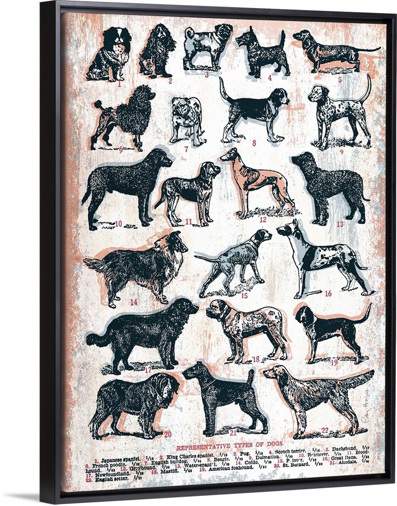 <p>A chart of 22 different types of dogs all listed by name and image in a retro art look.</p>