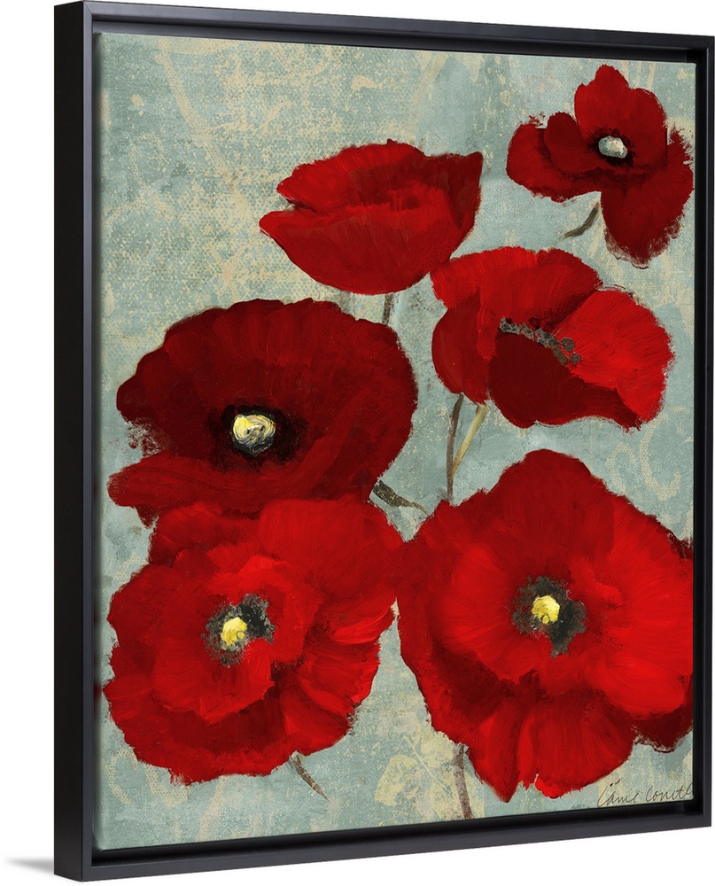 <p>Contemporary art piece of bright red poppy flowers on a textured cool background.</p>