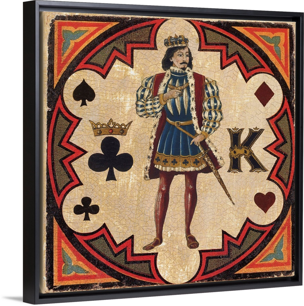 <p>Square vintage illustration of a King inside a circular design with a heart, spade, clover, and diamond surrounding him.</p>