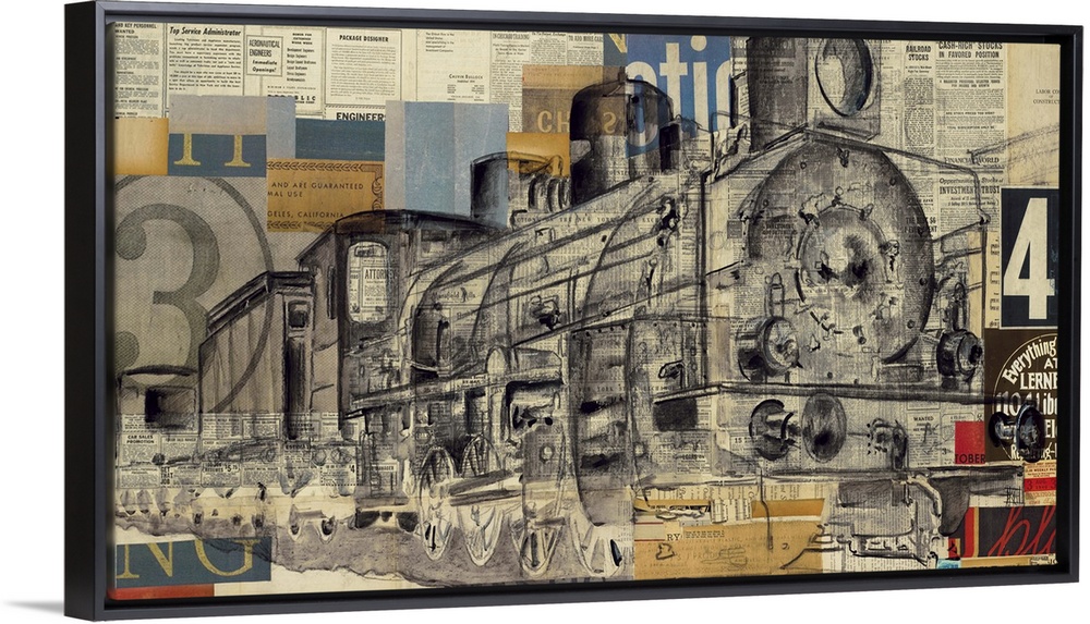 <p>Collage artwork incorporating numbers and letters over top of the image of a train engine.</p>