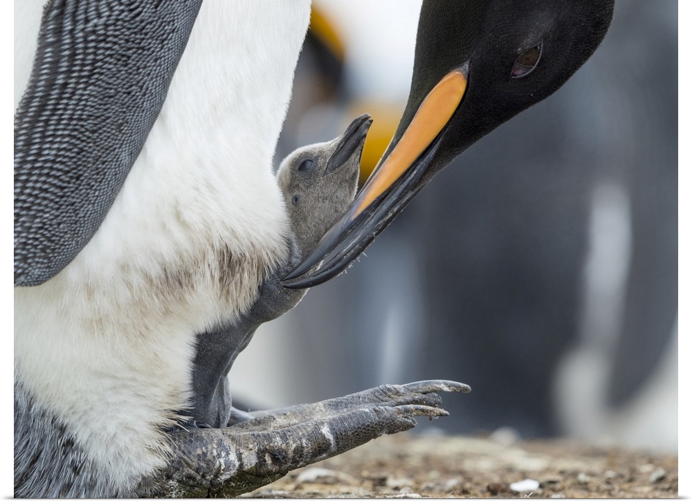 <p>King Penguin chick balancing on the feet of a parent, Falkland Islands.</p>