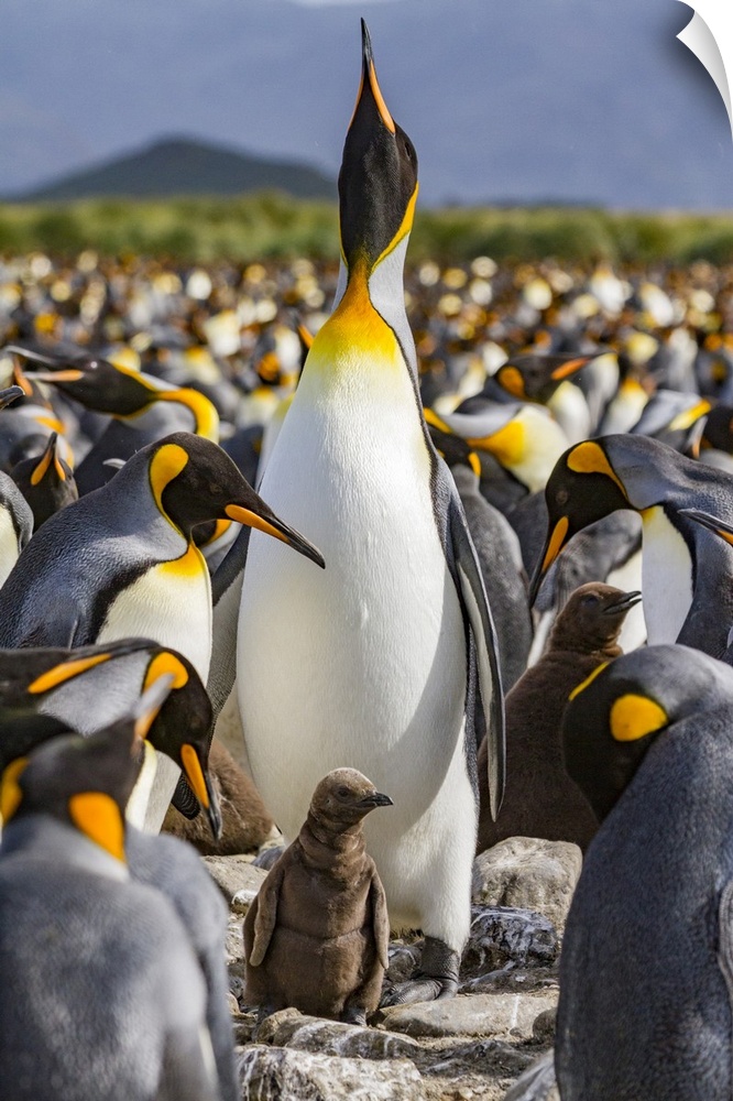 <p>King penguin (Aptenodytes patagonicus) adult and chick at breeding and nesting colony at Salisbury Plain, South Georgia, Polar Regions</p>