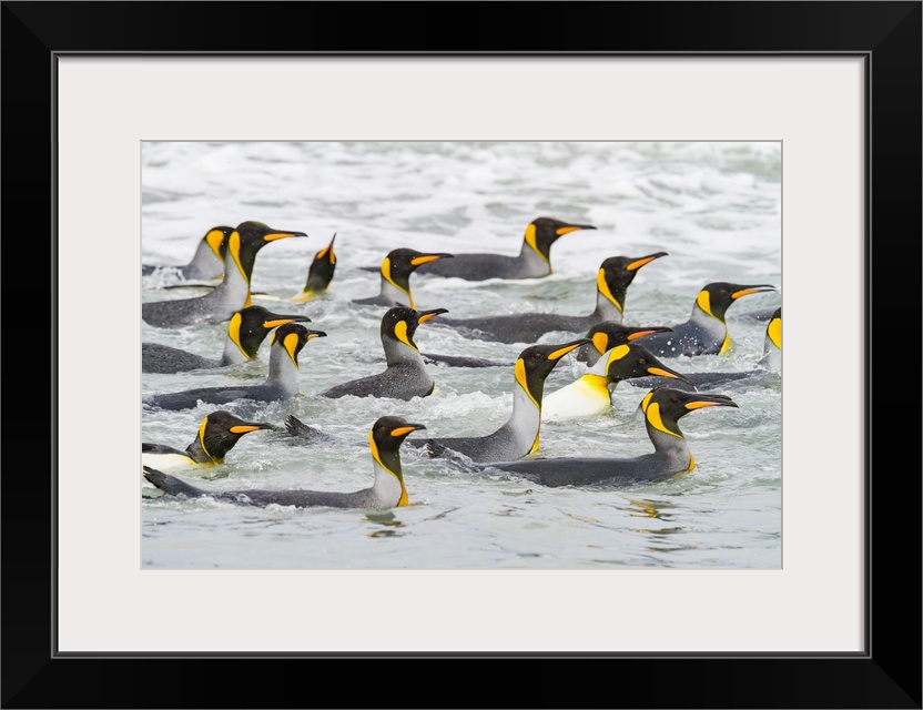 <p>King penguins (Aptenodytes patagonicus) swimming near the beach at breeding and nesting colony at Salisbury Plain in the Bay of Isles, South Georgia, Southern Ocean, Polar Regions</p>