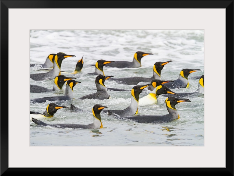 <p>King penguins (Aptenodytes patagonicus) swimming near the beach at breeding and nesting colony at Salisbury Plain in the Bay of Isles, South Georgia, Southern Ocean, Polar Regions</p>