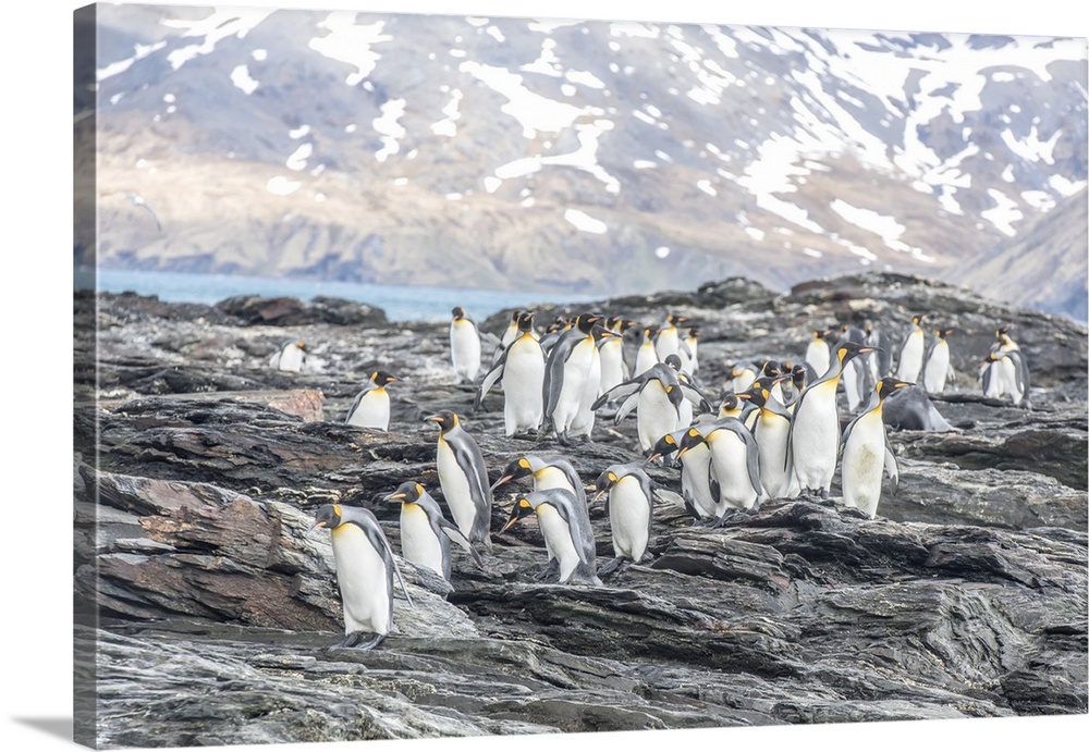 <p>King Penguins (Aptenodytes patagonicus) walking on the jagged, rocky shore of South Georgia Island South Georgia, Antarctica</p>