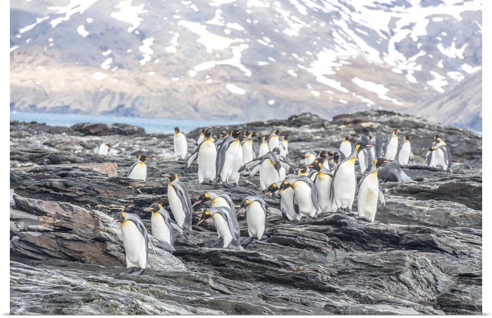 <p>King Penguins (Aptenodytes patagonicus) walking on the jagged, rocky shore of South Georgia Island South Georgia, Antarctica</p>