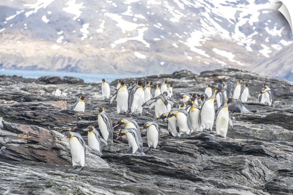 <p>King Penguins (Aptenodytes patagonicus) walking on the jagged, rocky shore of South Georgia Island South Georgia, Antarctica</p>