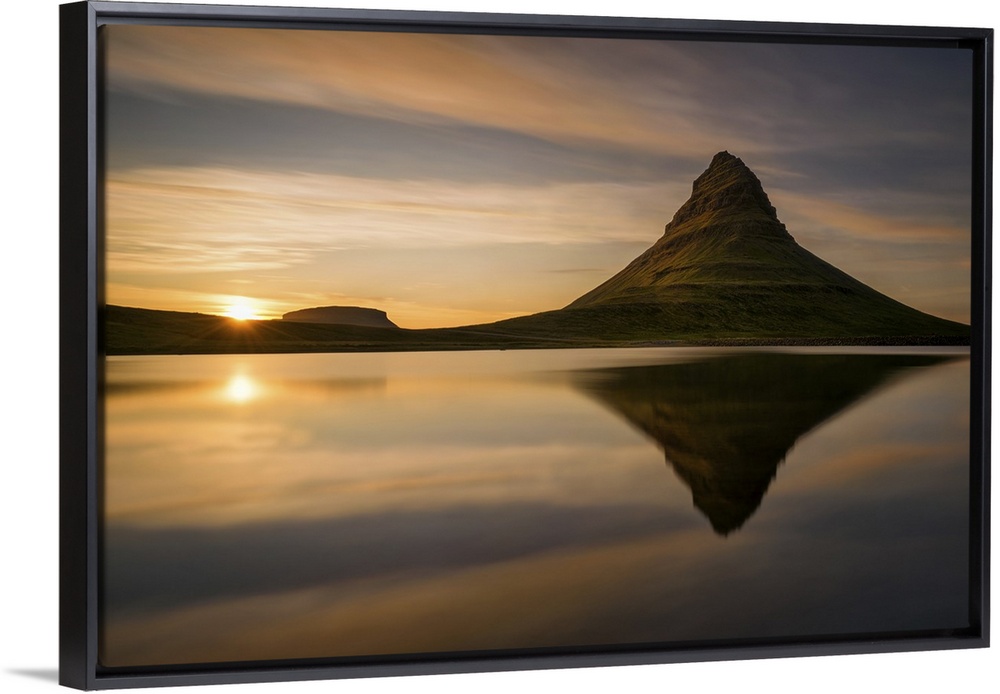 <p>Kirkjufell mountain at sunrise, reflected in the calm water below, Iceland.</p>